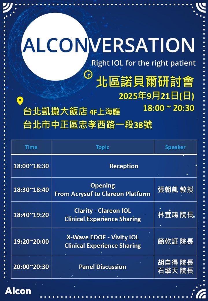2025年9月21日-感謝台灣Alcon公司同仁的壽劃,以及感謝林宜鴻 ,簡前証,石擎天三位醫師關於白內障人工晶體新知的分享。