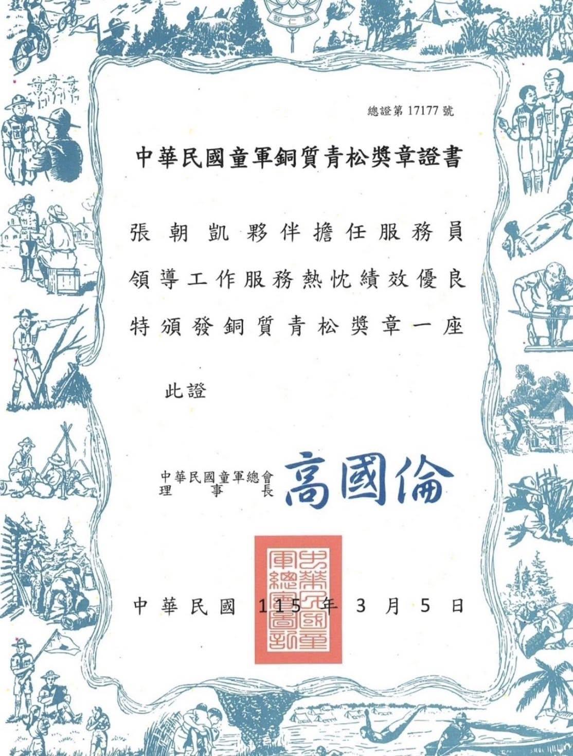 弟也很榮幸於近期獲頒「童軍團青松獎章」/建中行義童軍團(CKVScout)是建國中學的服務性社團,致力於推動建中學生及校友「團隊合作技能及社區服務工作」,長期公益形象獲得好評。