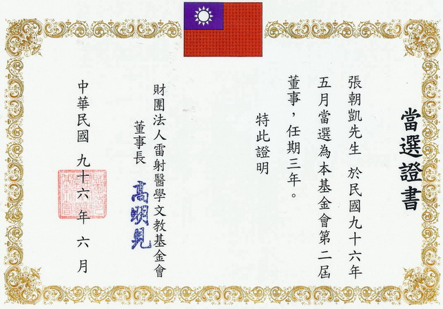 民國96年5月-當選證書-擔任財團法人雷射醫學文教基金會 第二屆董事