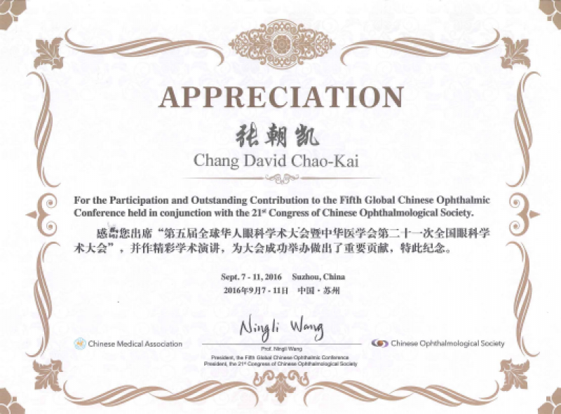 民國105年9月-感謝狀-第五屆全球華人眼科學術大會暨中華醫學會第二十一次全國眼科學術大會(CCOS)