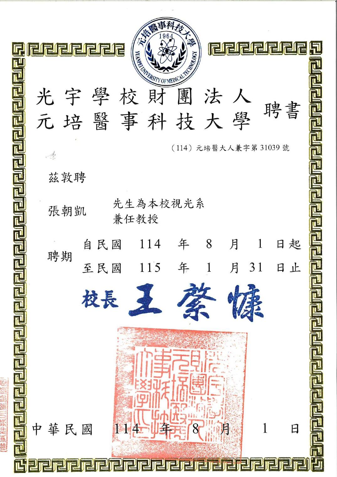 民國114年8月至115年1月-聘書-元培醫事科大視光系 兼任教授