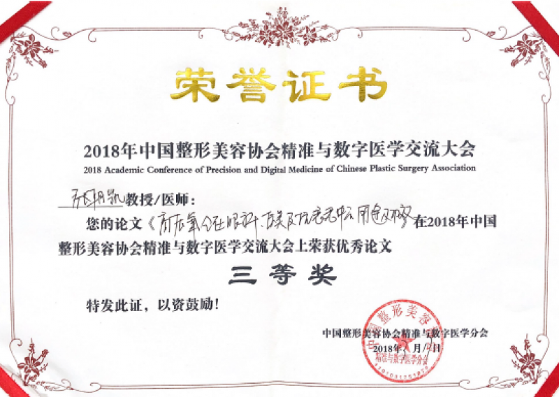 民國107年3月-榮譽證書-於2018年中國整形美容協會精準及數字醫學交流大會 榮獲優秀論文三等獎