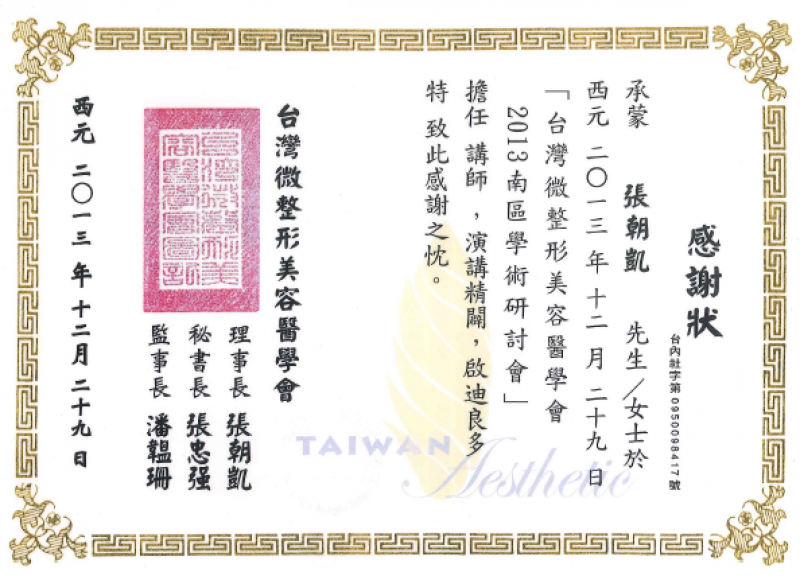 民國102年12月-感謝狀-台灣微整形美容醫學會2013南區學術研討會
