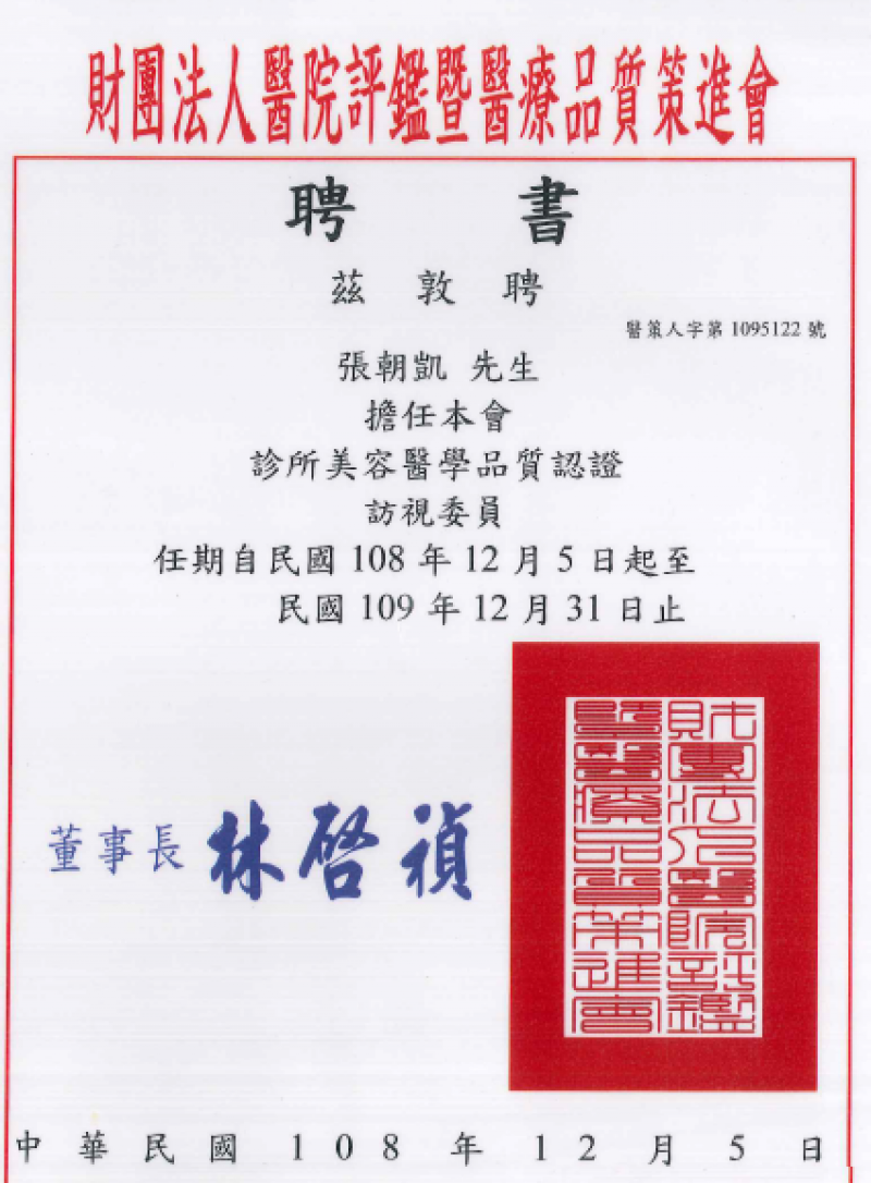 民國108年12月至109年12月-聘書-擔任<診所美容醫學品質認證>訪視委員