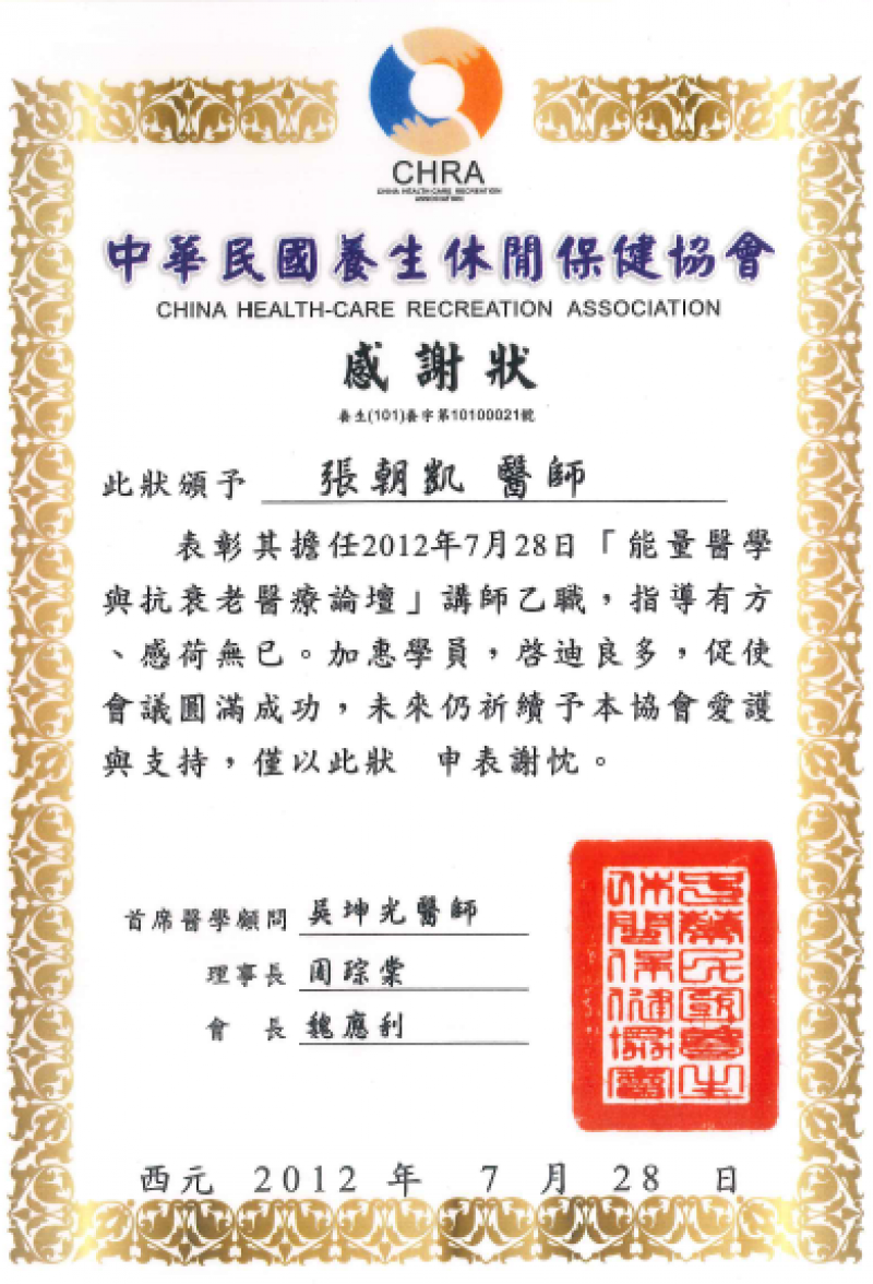 民國101年7月-感謝狀-中華民國養生休閒保健協會