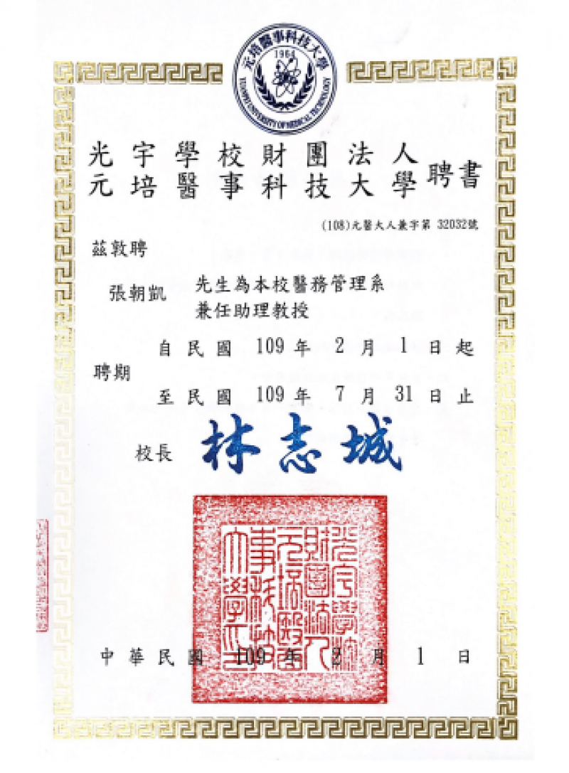 民國109年2月至109年7月-聘書-元培醫事科技大學-醫務管理系 兼任助理教授