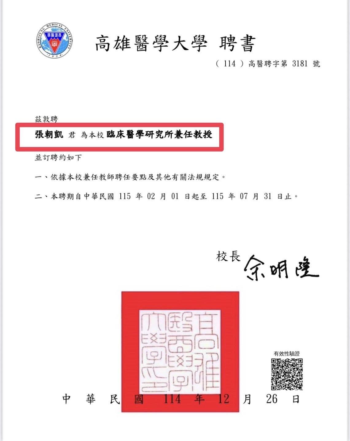2025年12月31日-收到來自「高雄醫學大學/臨床醫學研究所/兼任教授」的聘書