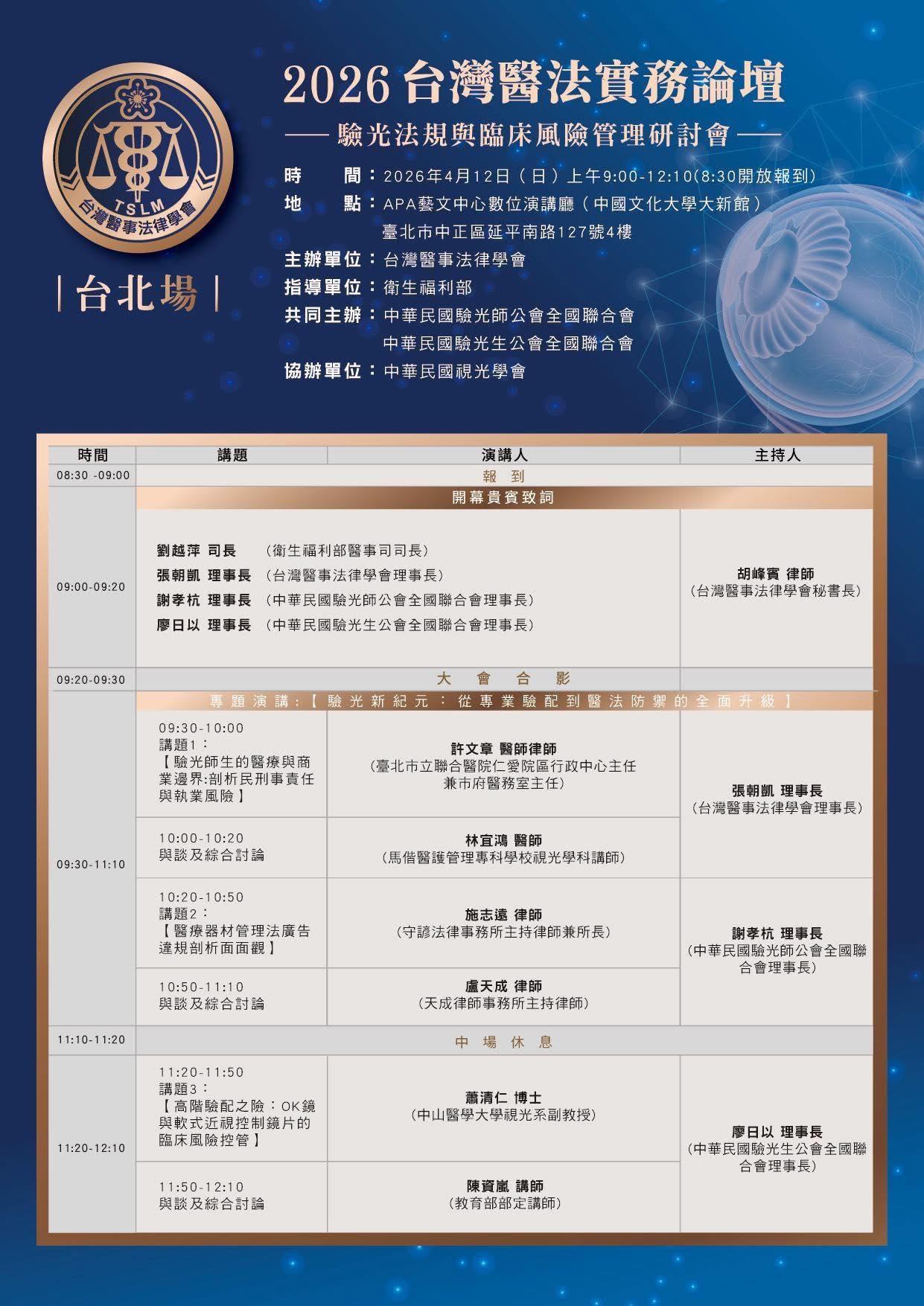 感謝「衞福部醫事司」劉越萍長官的指導,及「中華民國驗光師公會」「中華民國驗光生公會」謝孝杭及廖日以兩位理事長的共同協助,讓「台灣視光醫法論壇-台北場」取得圓滿成功。