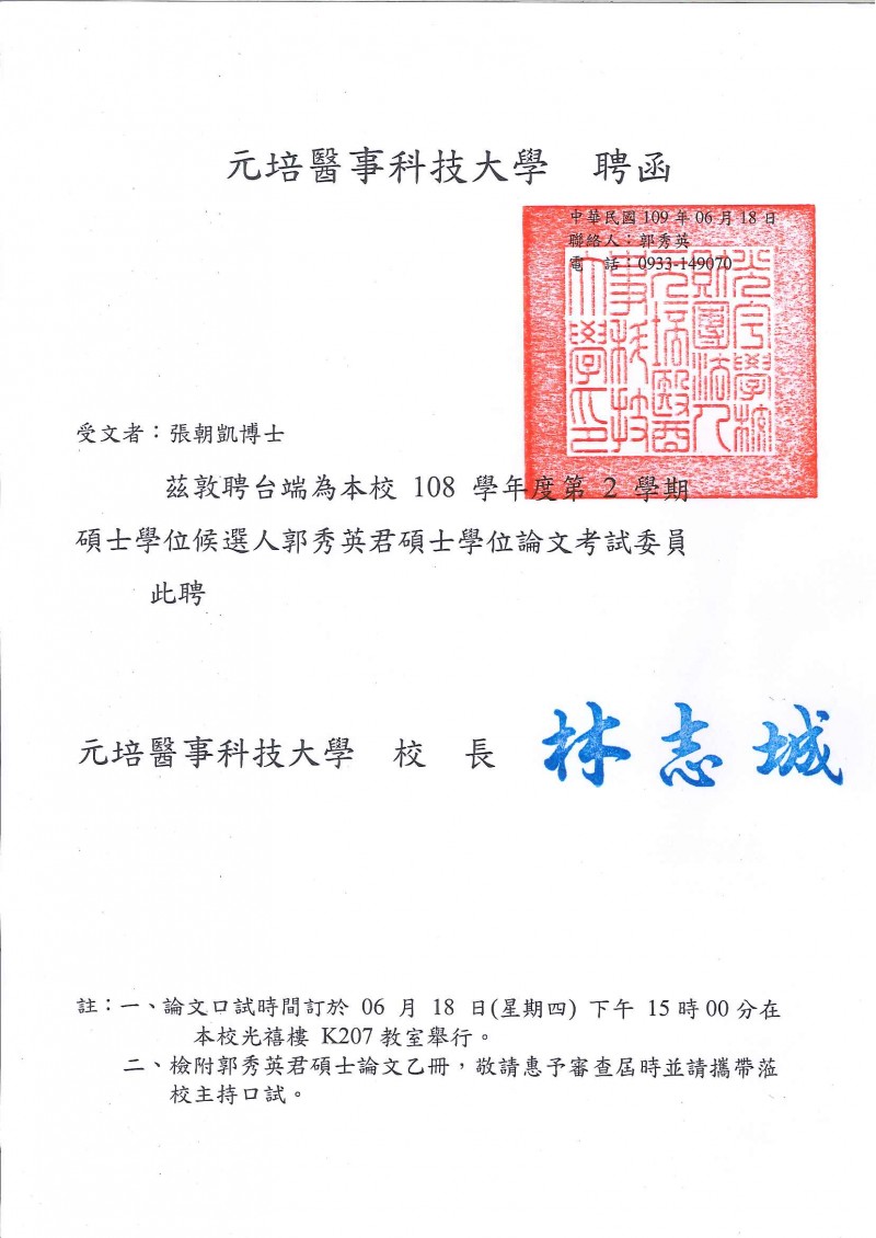 2020年6月18日張朝凱醫師擔任元培醫事科技大學碩士論文口試委員