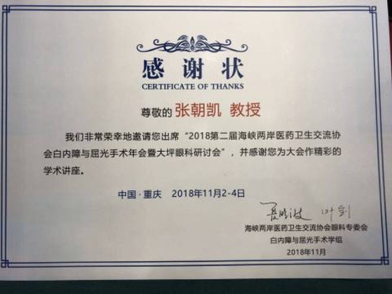 2018年11月3日諾貝爾眼科張朝凱醫師受邀參加海峽兩岸衛生交流協會白內障與屈光手術年會暨大坪眼科研討會
